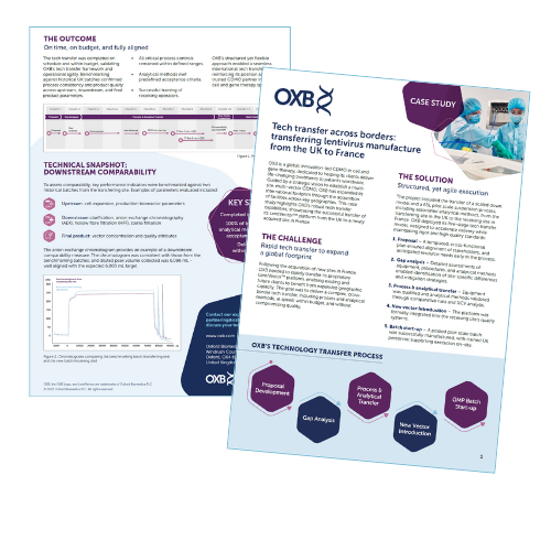 In this case study, learn how OXB, a global CDMO in cell and gene therapy, transferred its proprietary LentiVector™ platform from the UK to a newly acquired site in France. The project showcases OXB’s structured yet agile five-stage tech transfer model, combining scientific rigor with the adaptability needed to accelerate delivery.